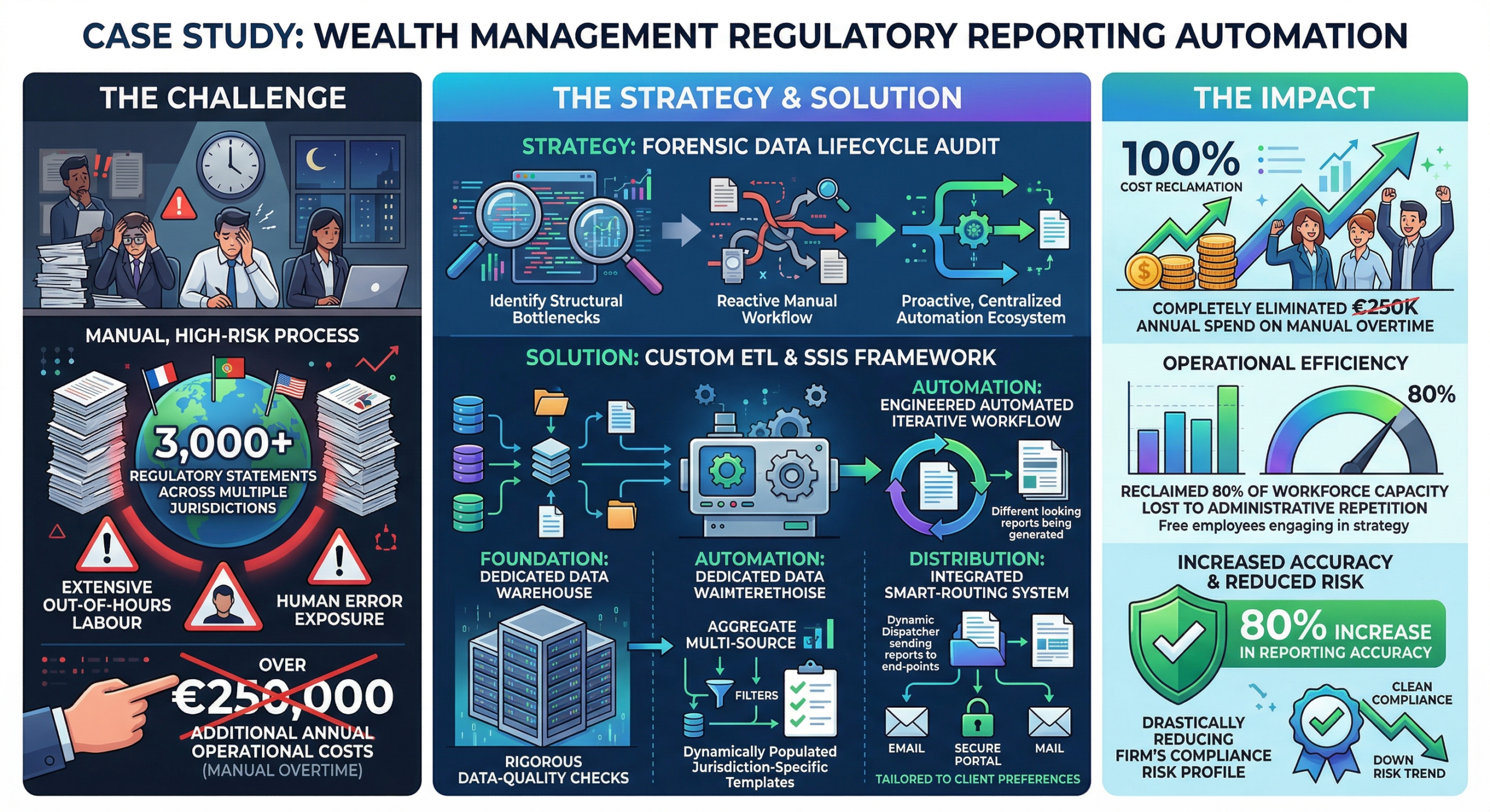 A prominent wealth management firm was facing a manual, high-risk process. I was generating and distributing over 3,000 regulatory statements across multiple jurisdictions. This required extensive out-of-hours labour, resulting in over €250,000 in additional annual operational costs and significant exposure to human error.